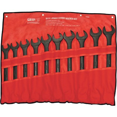 | Grip-On JUMBO wrenches are constructed of drop-forged, heat-treated steel with black oxide finish to resist rust and corrosion. Precision-machined open and boxed ends in SAE sizes. Wrench lengths range from 17 1/2in. to 23 1/2in. for heavy-duty applications. Raised panel provides added strength. Includes heavy duty roll-up storage pouch. Pieces (qty.): 10, SAE Size(s) (in.): 1 5/16, 1 3/8, 1 7/16, 1 1/2, 1 5/8, 1 11/16, 1 3/4, 1 13/16, 1 7/8, 2, Material Type: Drop-forged steel, Finish Type: Heat-treated steel, Storage Type: Pouch ...Read